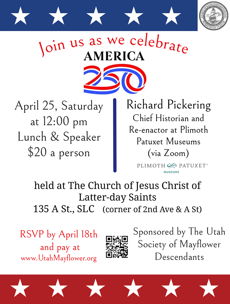 Cousins, our next semi-annual meeting will be on May 2026, 6:00 pm at the Sons of Utah Pioneers National Headquarters, 3301 E. Louise Ave., Millcreek. Our tried-and-true menu includes Inside-Out Chicken Cordon Bleu (Chicken breast topped with ham, melted Swiss and creamy white gravy) served with garlic mashed potatoes, mixed greens salad, roll, and mini cheesecake with strawberry sauce, $35.00 each. Purchase your meal through the state website, utahmayflower.org. Please list any of your guests’ names in the description line. Deadline for reservations is Saturday, October 25th. Also, if you know of any musically talented people that would like to share their talents, please talk with someone on the board. Our Captain David Wilkinson, Descendant of William White will be present to lead us in the Pledge of Allegiance and read the Mayflower Compact. Thank you David.